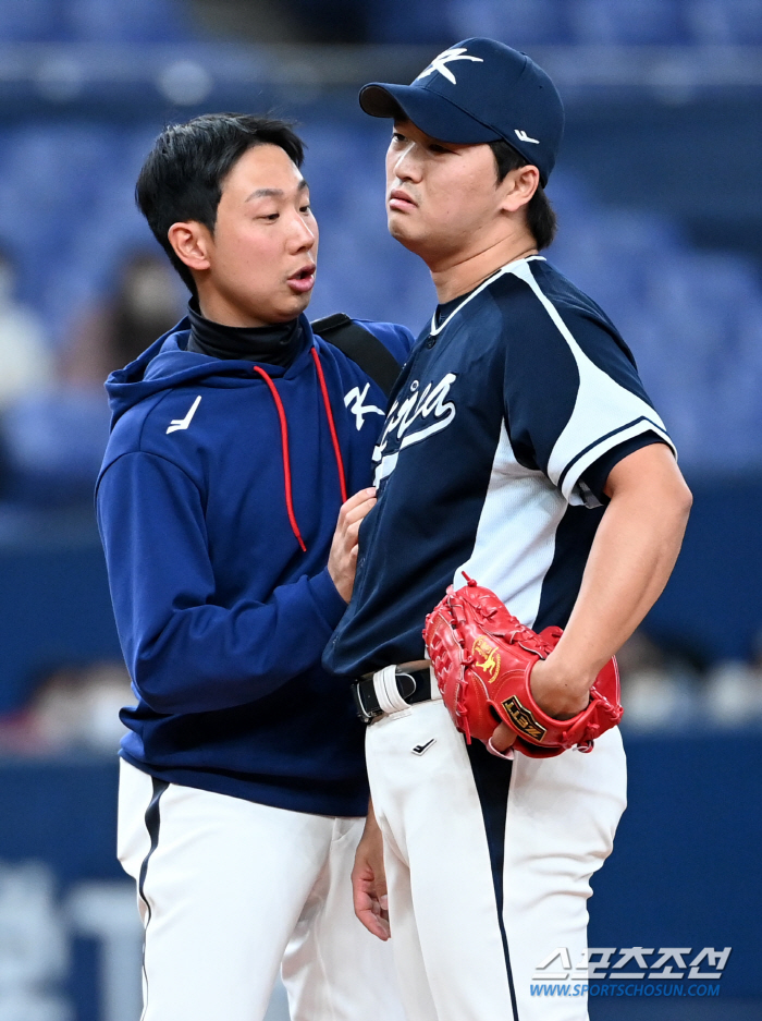 2023 월드베이스볼클래식(WBC) 한국대표팀이 6일 일본 오사카 교세라돔에서 오릭스와 공식 평가전을 가졌다. 8회말 투구를 하던 한국 고우석이 몸의 이상을 느낀 후 트레이닝 코치의 점검을 받고 있다. 오사카=허상욱 기자wook@sportschosun.com/2023.03.06/