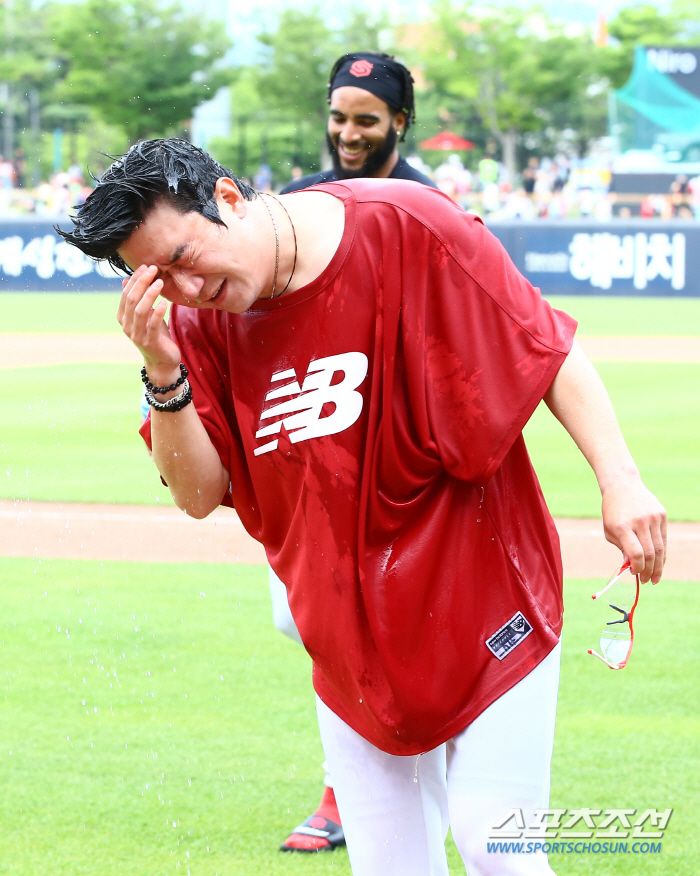 이날 경기 승리를 합작한 두 좌완투수의 뜨거운 포옹이 이어지는 사이 선수들의 물폭탄 세례가 이어졌고 서로를 꼭 안은 두 선후배는 온 몸에 물을 뒤집어 쓴 채 동료들의 축하세례를 만끽 했다.