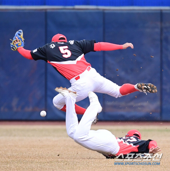14일 대구삼성라이온즈파크에서 KBO리그 시범경기 삼성과 KIA의 경기가 열렸다. 1회 2사 3루에서 오재일의 뜬볼 타구를 잡기 위해 KIA 윤도현과 김도영(위)이 몸을 날리고 있다. 대구=송정헌 기자songs@sportschosun.com/2022.03.14/