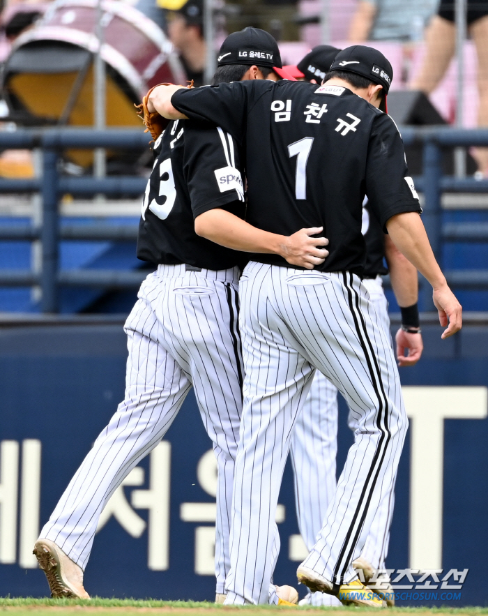 2023 KBO리그 LG 트윈스와 KIA 타이거즈의 경기가 28일 광주KIA챔피언스필드에서 열렸다. 6회말 수비를 마친 LG 임찬규가 수비에서 실책을 범한 유격수 송대현을 격려하고 있다. 광주=허상욱 기자wook@sportschosun.com/2023.05.28/