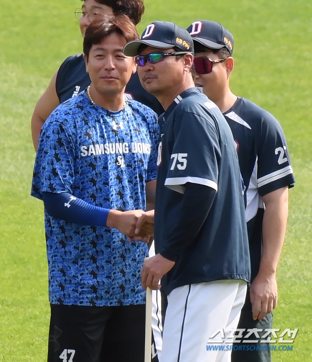 30일 인천 SSG랜더스필드. 삼성 라이온즈와 SSG 랜더스의 주중 3연전 첫 경기를 앞두고 야구인들의 만남의 장이 펼쳐졌다. 승패를 다퉈야 하는 적이지만, 모두가 야구로 맺어진 동료다. 4월 13일 대구 3연전 후 47일 만의 재회. 양 팀의 코치들과 몇몇 베테랑 선수들이 반갑게 만나 이야기꽃을 피웠다.