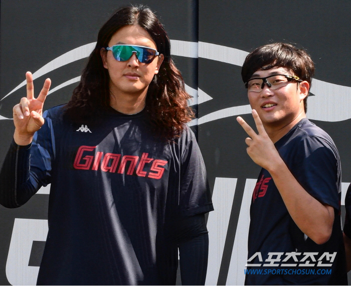 훈련 막바지 취재진 카메라를 발견한 뒤 김원중은 박세웅과 함께 해맑게 웃으며 손가락으로 승리의 브이 포즈를 취했다.