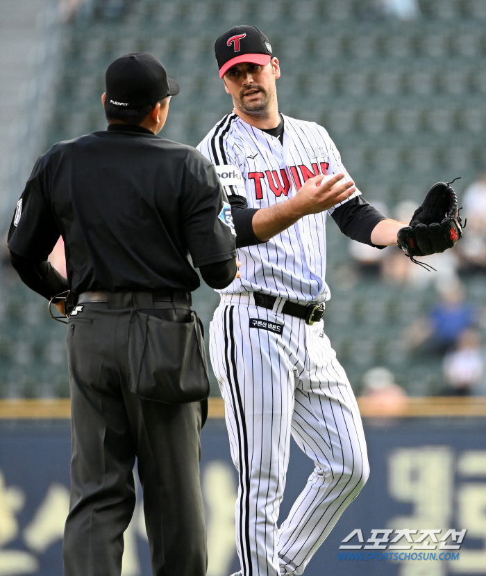 2023 KBO리그 삼성 라이온즈와 LG 트윈스의 경기가 13일 잠실야구장에서 열렸다. LG 선발투수 플럿코가 1회초 삼성 김재성 타석때 박종철 구심에게 어필하고 있다. 잠실=허상욱 기자 wook@sportschosun.com/2023.06.13/