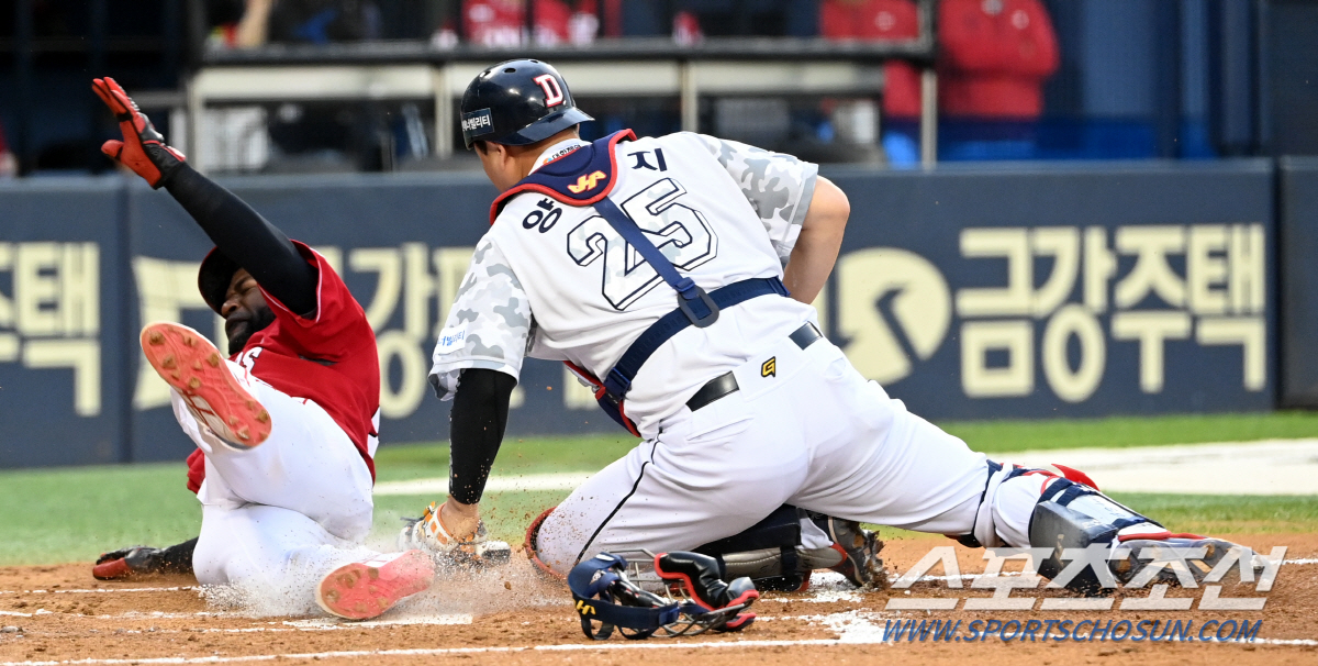 2023 KBO리그 SSG 랜더스와 두산 베어스의 경기가 20일 잠실야구장에서 열렸다. 2회초 무사 1,3루 SSG 오태곤의 스퀴즈번트때 3루주자 에레디아가 홈으로 파고들다 태그아웃되고 있다. 두산 포수는 양의지. 잠실=허상욱 기자 wook@sportschosun.com/2023.06.20/