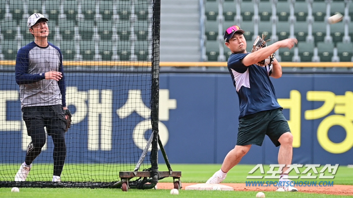 워밍업과 타격 훈련을 마친 양의지가 김재호와 함께 유격수 위치에서 펑고를 받아내며 타구 감을 익혔다.