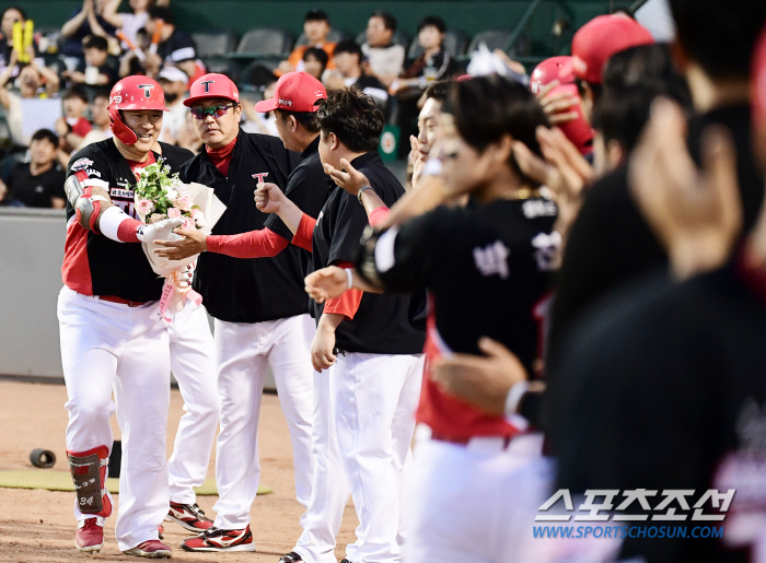 | 최형우에게 축하 꽃다발을 전달한 김종국 감독. 대전=송정헌 기자songs@sportschosun.com |