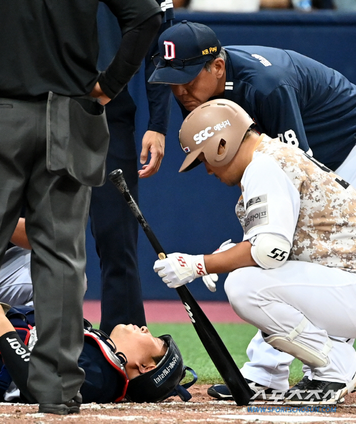 양의지가 걱정스러운건 곽빈도 마찬가지였다. 곽빈은 허리를 숙인 채 양의지의 상태를 지켜봤고 그 모습을 본 이지영도 곽빈을 툭 치며 다독였다.
