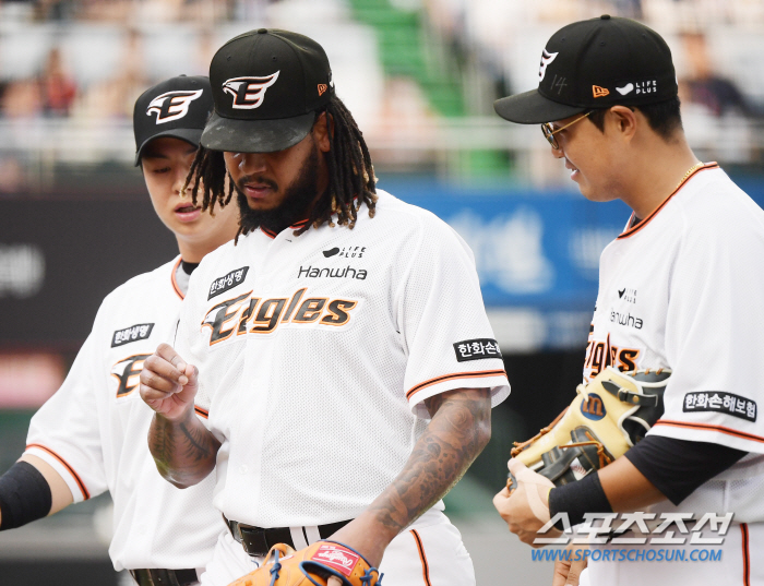 | 2회 투구 도중 엄지 손톱 부위에 피가 난 페냐가 이닝을 마친 후 들어오고 있다. 대전=정재근 기자 cjg@sportschosun.com |