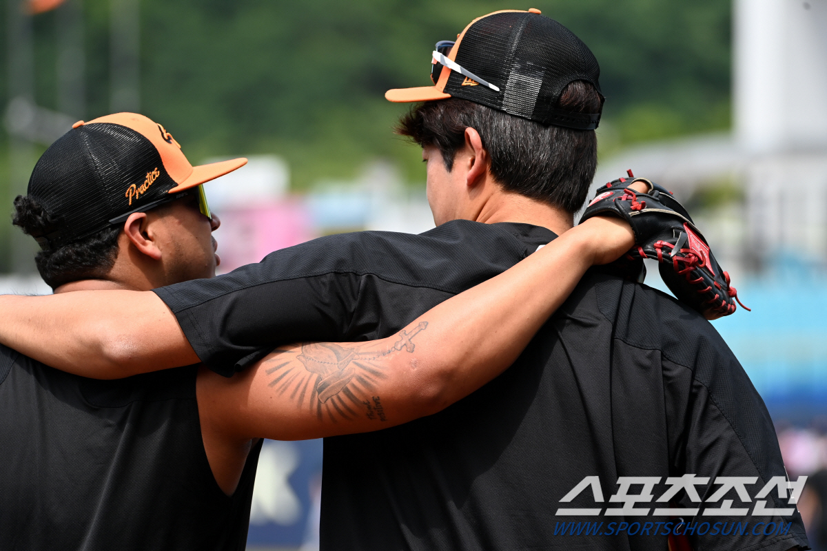 7월 2일 대구 삼성전에 앞서 산체스와 이태양이 어깨동무를 한 채 그라운드로 나서고 있다. 대구=허상욱 기자 wook@sportschosun.com