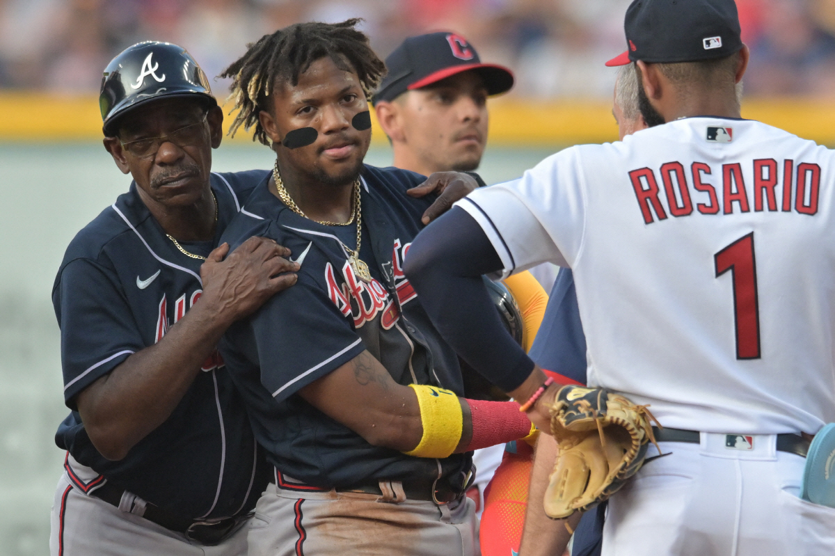 애틀랜타 브레이브스 로날드 아쿠냐 주니어가 3회초 2루 도루에 성공한 뒤 오른쪽 어깨 통증을 호소하자 론 워싱턴 3루코치가 다가와 그의 양쪽 어깨를 감싸안으며 상태를 묻고 있다. USATODAY연합뉴스