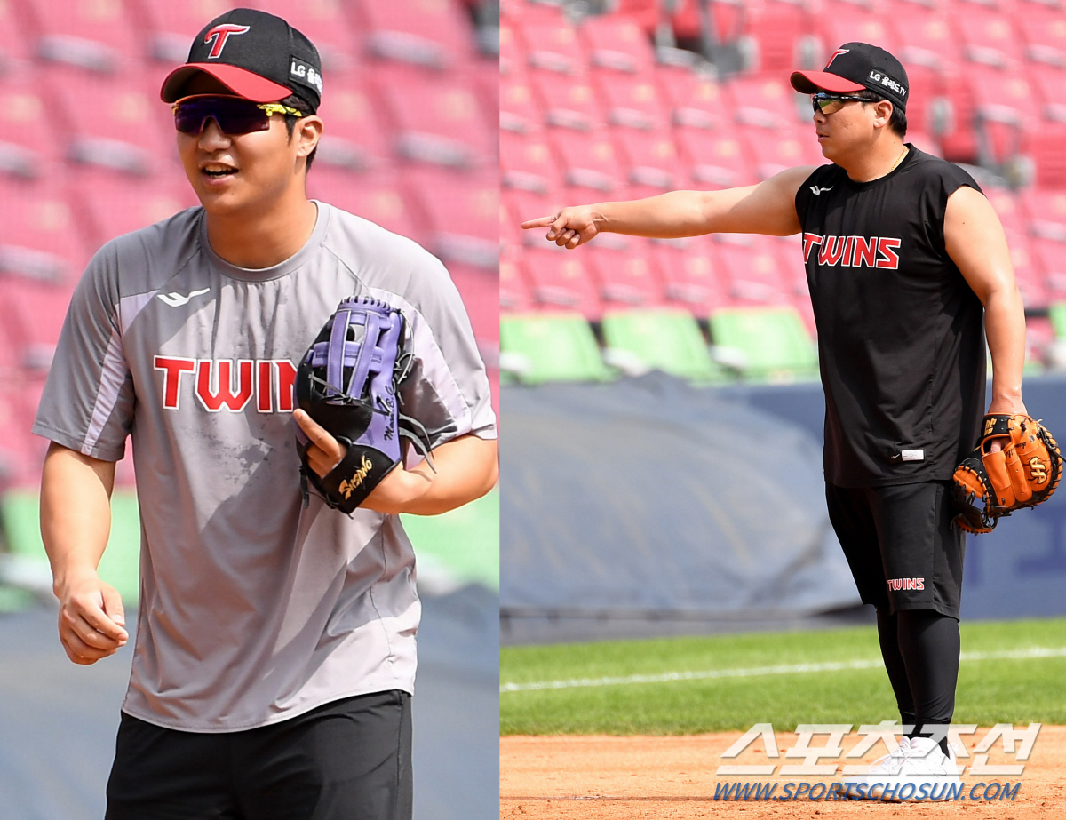 가만히 서 있기만 해도 땀 흐를 정도로 덥고 습한 날씨를 보인 5일 잠실구장. 최고참 포수 허도환과 국가대표 3루수 문보경이 함께 구슬땀을 흘리며 즐겁게 훈련을 소화했다.