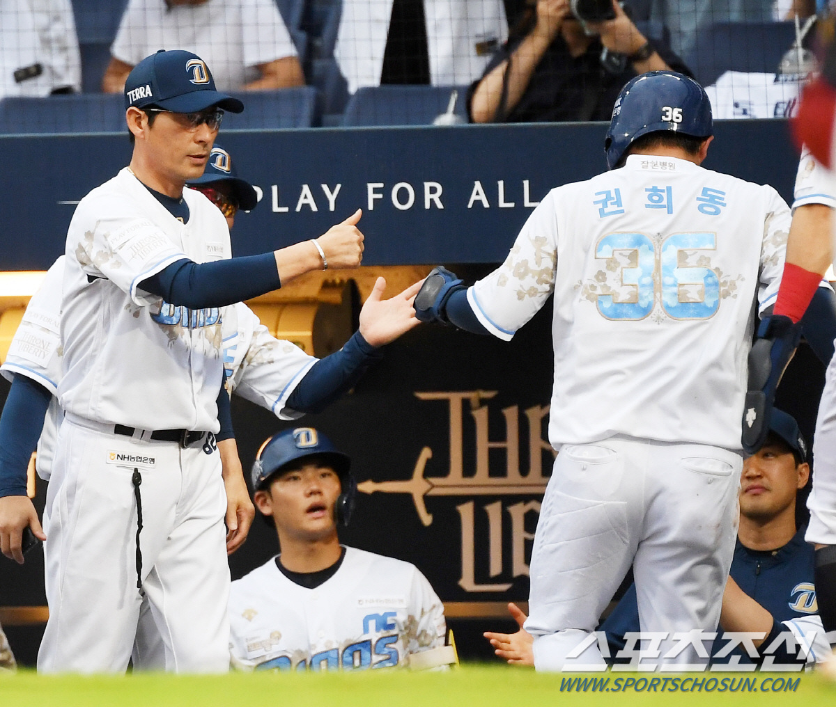 2023 KBO리그 NC 다이노스와 롯데 자이언츠의 경기가 13일 창원NC파크에서 열렸다. 1회말 1사 만루 NC 윤형준의 적시타 때 득점한 권희동을 강인권 감독이 반기고 있다. 창원=박재만 기자pjm@sportschosun.com