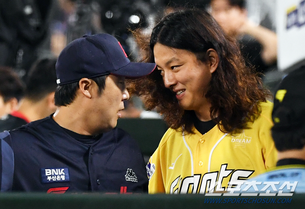 2023 KBO리그 퓨처스리그 올스타전이 14일 부산 사직구장에서 열렸다. 남부리그 올스타 더그아웃을 찾은 김원중이 배영수 코치와 인사를 나누고 있다. 부산=박재만 기자pjm@sportschosun.com/2023.07.14/