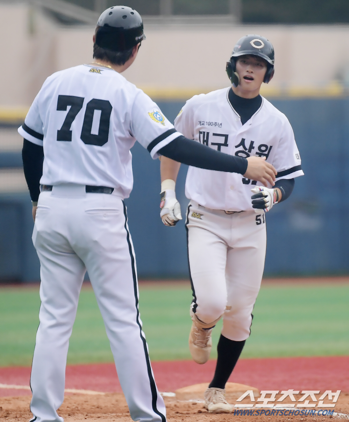 16일 서울 목동야구장에서 열린 제78회 청룡기 전국고교야구선수권대회 K-POP고와 대구상원고의 경기. 2회말 무사 대구상원고 강태완이 K-POP고 권준형을 상대로 우월 솔로포를 친 후 환영받고 있다. 목동=정재근 기자 cjg@sportschosun.com/2023.7.16/