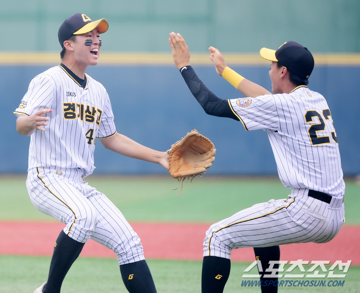 22일 서울 목동구장에서 열린 제78회 청룡기 전국고교야구선수권대회 경기상업고와 대구상원고의 8강전. 경기상업고 임진묵이 5⅓이닝 무실점 호투로 4대3 역전승을 견인했다. 임진묵(왼쪽)이 유은종과 환호하고 있다. 목동=정재근 기자 cjg@sportschosun.com/2023.7.22/