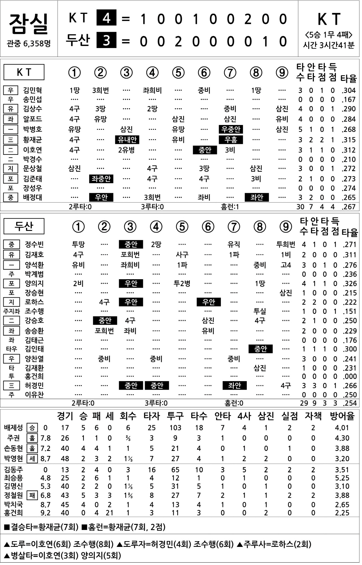 [2023 KBO리그 기록실] KT vs 두산 (8월 4일)