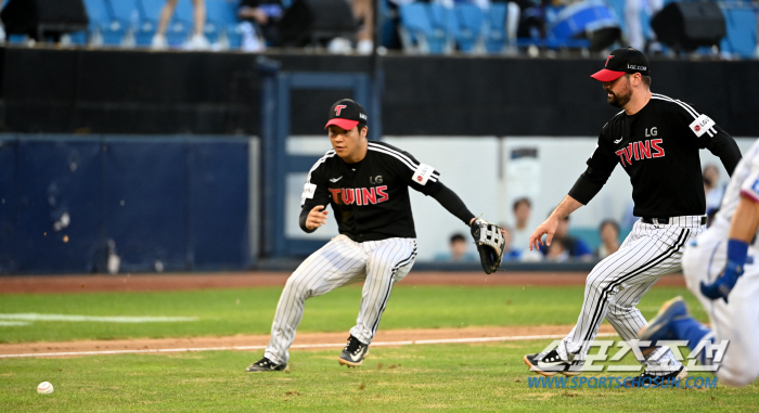 2023 KBO리그 LG 트윈스와 삼성 라이온즈의 경기가 15일 대구 삼성라이온즈파크에서 열렸다. 6회말 무사 1,2루 LG 문보경과 플럿코가 삼성 김성윤의 번트에 당황하고 있다. 대구=허상욱 기자wook@sportschosun.com/2023.08.15/