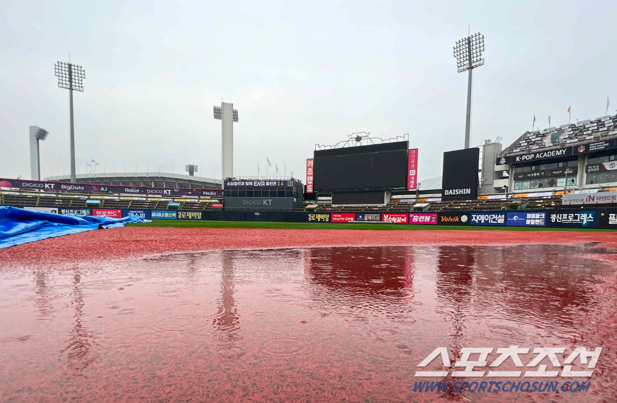 경기 시작을 4시간여 앞둔 오후 2시경 KT위즈파크는 비가 약해졌다 강해졌다를 반복하고 있는 상황에 그라운드에는 일찌감치 방수포가 덮여있다. 내린 비로 인해 방수포 위는 빗물이 흥건하게 고여있고 1루 파울라인 안쪽에는 빗물이 흥건하게 고여 푹 젖어 있는 상태다.