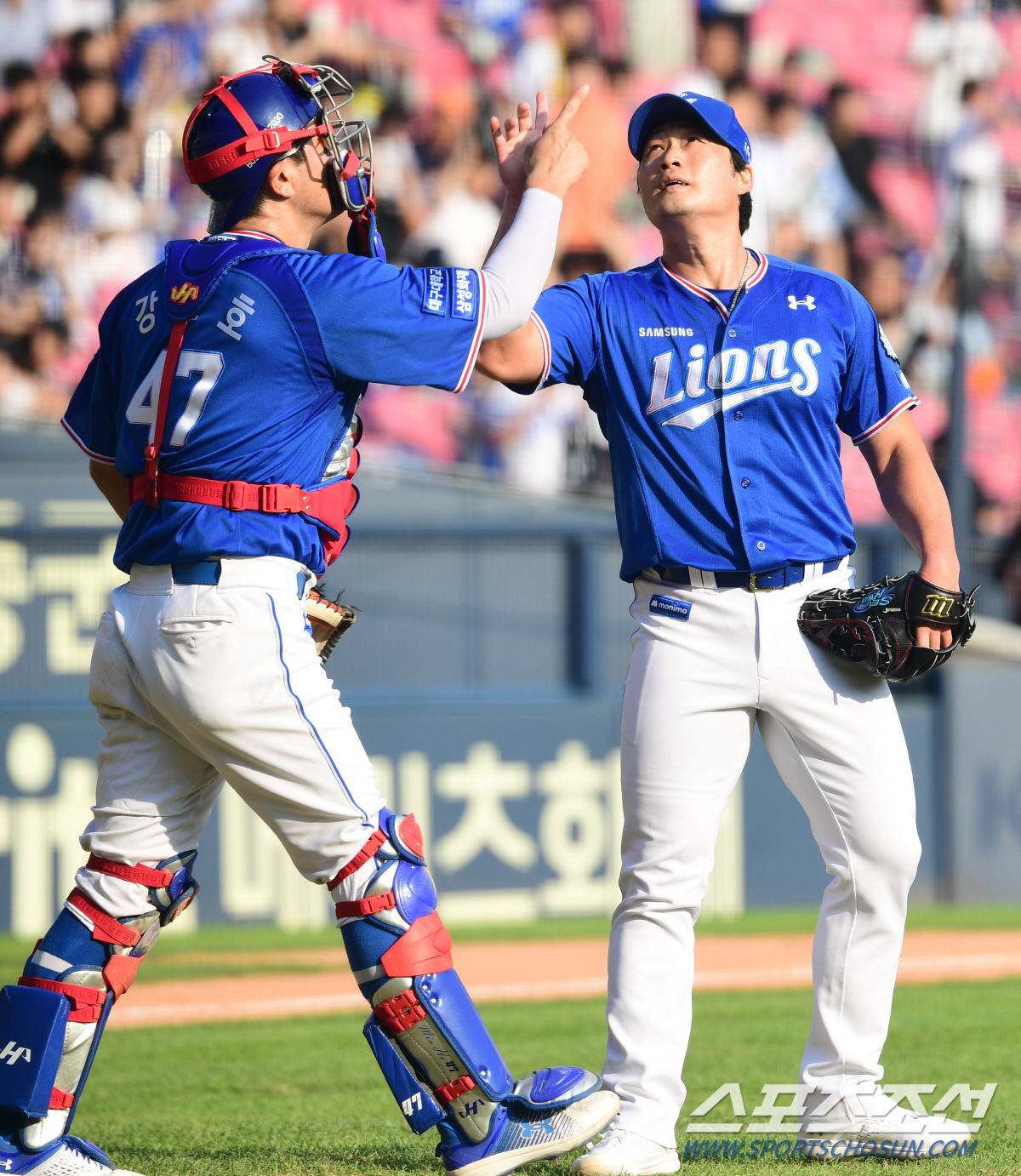 | 9일 서울잠실야구장에서 열린 두산과 삼성의 DH1차전,,삼성 마무리 오승환이 팀의 5대1 승리를 확정짓고 강민호와 하이파이브하고 있다. 잠실=최문영 기자deer@sportschosun.com /2023.09.09/ |