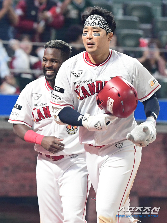 4일 인천SSG랜더스필드에서 열린 NC와 SSG의 경기, SSG 한유섬이 5회말 2사 1,2루에서 중월 3점포를 치고 에리데아와 기뻐하고 있다. 인천=최문영 기자deer@sportschosun.com /2023.10.04/