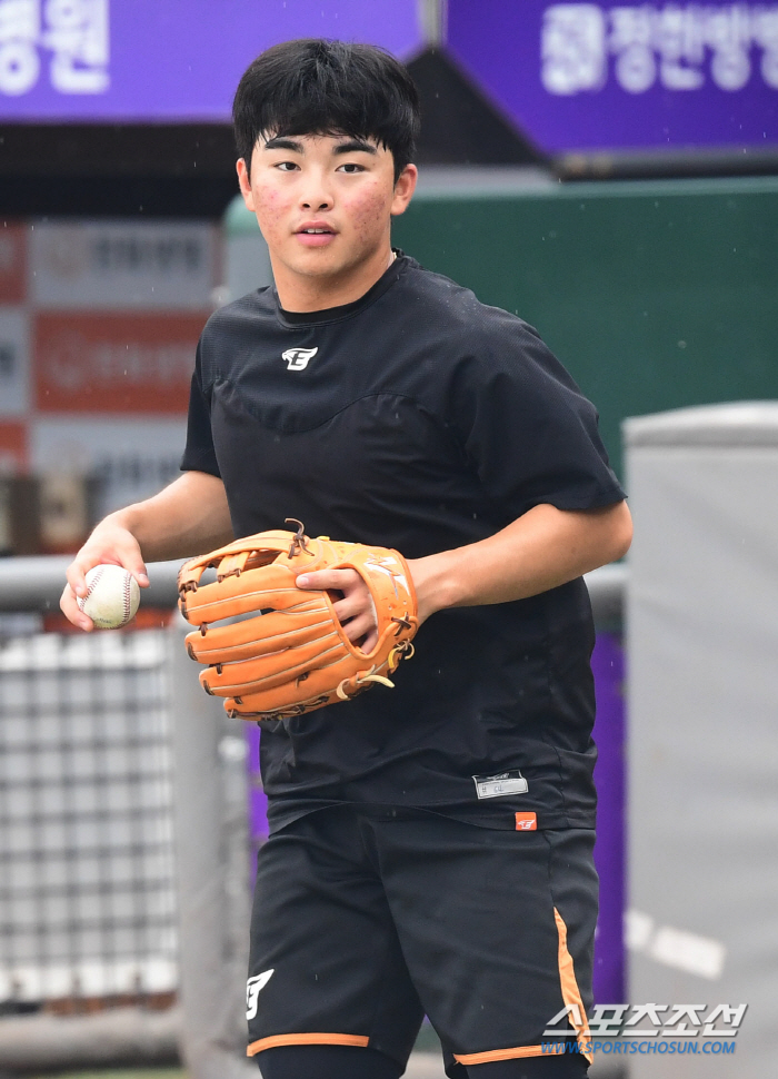 16일 KT와 한화의 경기를 앞둔 한화이글스파크에 비가 내리는 가운데 문현빈이 수비 훈련을 하고 있다. 대전=최문영 기자deer@sportschosun.com /2023.09.16/