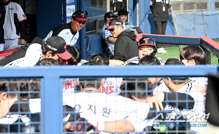홈런을 친 뒤 더그아웃에 들어가 세리머니를 함께 하는 장면도 재미있었다. 자신이 던진 배트를 직접 주워들고 홈을 밟은 김범석은 더그아웃에 들어가더니 빠르게 달려갔다. 이미 선배들이 어깨동무로 둥글게 원을 그려 홈런 세리머니를 하고 있었던 것. 김범석은 빠르게 그 사이를 파고 들어가 함께 자신의 홈런 세리머니를 즐겼다. 잠실=권인하 기자 indyk@sportschosun.com