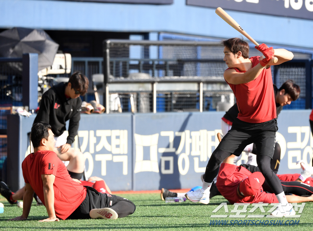 '아이고 허리야' 베테랑 김강민이 스트레칭에 집중하는 사이 최지훈은 벌써부터 배트를 들고나와 스윙을 했다.