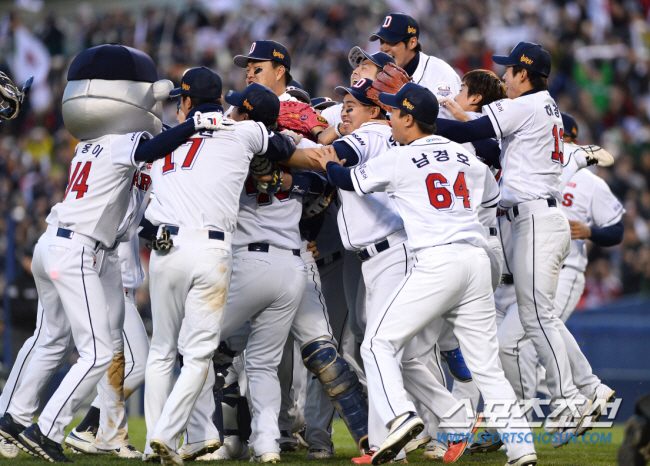 두산이 14년 만에 한국시리즈 우승을 차지했다. 두산 베어스는 10월 31일 잠실구장에서 열린 한국시리즈 5차전 삼성과 경기에서 13대 2 대승을 거두며 시리즈 전적 4승 1패로 우승을 차지했다. 우승이 확정되자 두산 선수들이 환호하고 있다. 잠실=송정헌 기자 songs@sportschosun.com/2015.10.31
