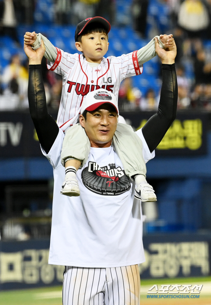 6일 잠실야구장에서 열린 KIA와 LG의 경기, 경기 종료 후 펼쳐진 LG 트윈스의 정규시즌 우승 세리머니에서 오지환이 아들과 함께 우승의 기쁨을 함께 하고 있다. 잠실=허상욱 기자wook@sportschosun.com/2023.10.06/