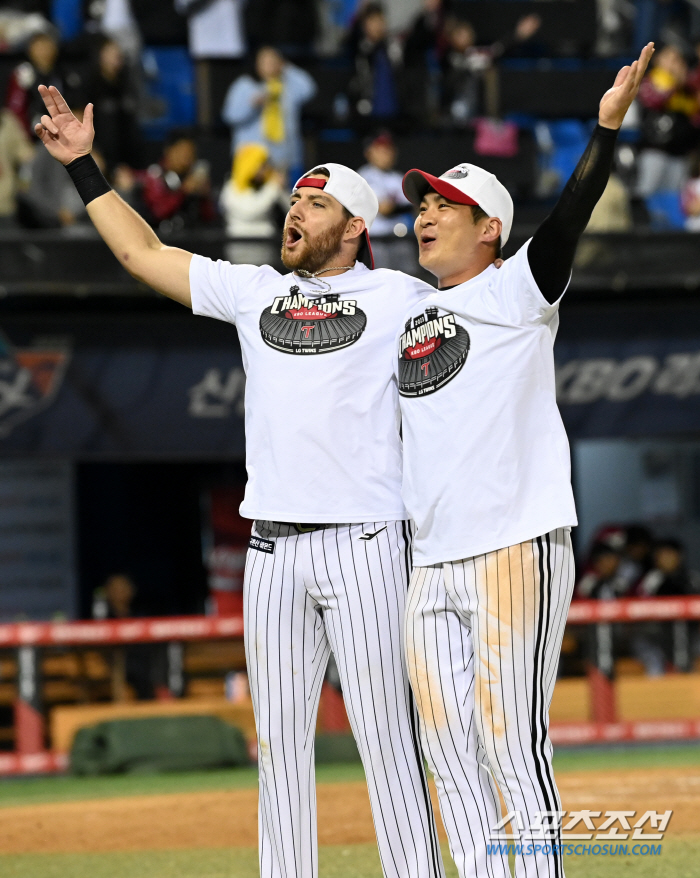 6일 잠실야구장에서 열린 KIA와 LG의 경기, 경기 종료 후 펼쳐진 LG 트윈스의 정규시즌 우승 세리머니에서 오스틴과 오지환이 우승의 기쁨을 함께하고 있다. 잠실=허상욱 기자wook@sportschosun.com/2023.10.06/