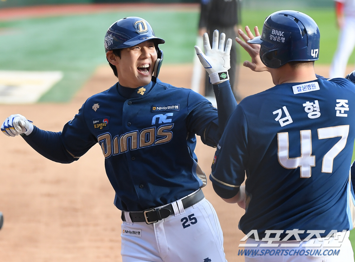 홈에서 홈런 타자를 기다리고 있던 김형준과 윤병호 코치는 김성욱이 홈 베이스를 밟는 순간 머리와 엉덩이를 툭 치며 격하게 반겼다. 대타 홈런의 주인공 김성욱이 더그아웃에 들어서자, 강인권 감독도 앞으로 나와 하이 파이브를 나눴다.