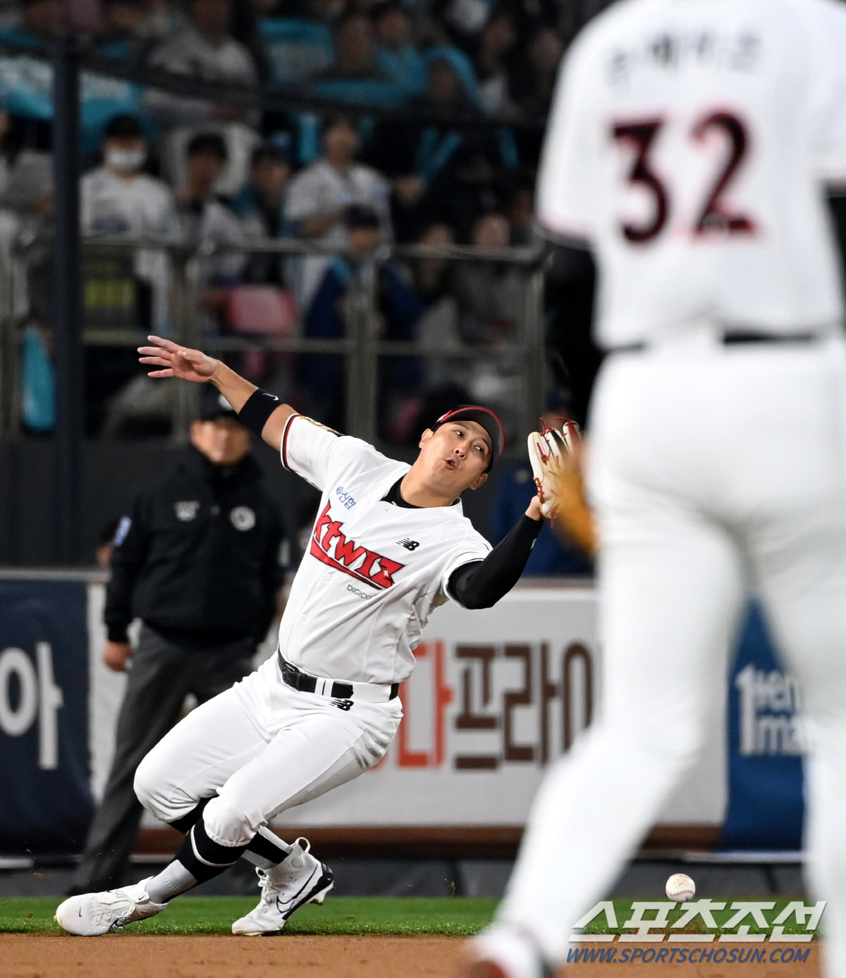 그런데 무슨 일이었을까. 3루수 황재균이 이 평범한 타구를 놓치고 말았다. 국가대표 출신, FA 계약으로만 무려 148억원을 번 산전수전 다 겪은 리그 최고 3루수의 실수라고는 믿기 힘든 장면이었다. 안 그래도 초반 실점에 불안하던 쿠에바스와 KT 선수들 힘이 쭉 빠지는 장면이었다.
