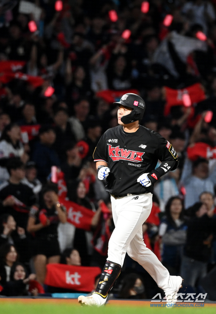 7회초 KT가 드디어 기다리던 추가점을 얻었다. 태너에 이어 올라온 두번째 투수 김영규와 상대한 선두 6번 문상철이 좌측 담장을 넘어가는 솔로포를 터뜨린 것. 풀카운트 승부끝에 6구째 130㎞ 가운데 낮은 슬라이더를 걷어올려 홈런을 만들어냈다. 1차전 페디에 솔로포를 친 뒤 두번째 홈런이 가장 필요한 시기에 나왔다.
