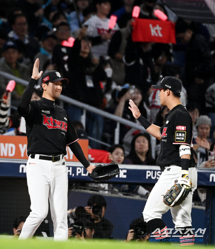 멋진 수비를 선보인 배정대를 보는 고영표의 얼굴엔 흐뭇한 미소가 번졌다. 고영표는 더그아웃으로 발걸음을 옮긴 후 짜릿한 하이파이브를 나누며 수비진을 맞이했다.