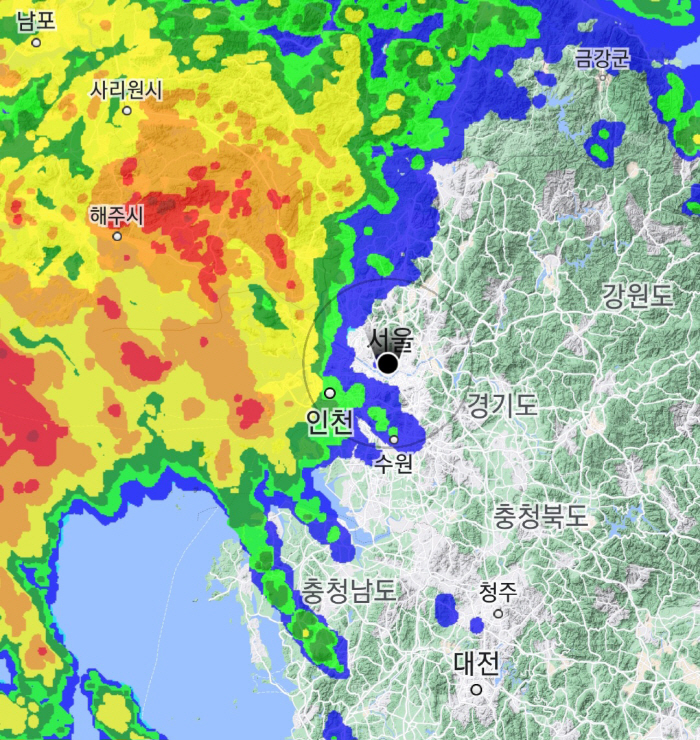 그런데 기상 레이더를 보면, 큰 비구름이 수원을 지나치지는 않을 것으로 보인다. 절묘하게 수원 왼쪽 방향 도시 위쪽으로 빗겨나가는 분위기다.