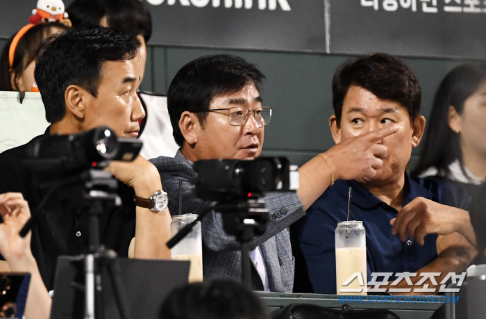 2023 KBO리그 한화 이글스와 KIA 타이거즈의 경기가 21일 대전 한화생명이글스파크에서 열렸다. 류중일 AG대표팀 감독과 조계현 전력강화위원장이 대화를 나누고 있다. 대전=박재만 기자pjm@sportschosun.com/2023.09.21/