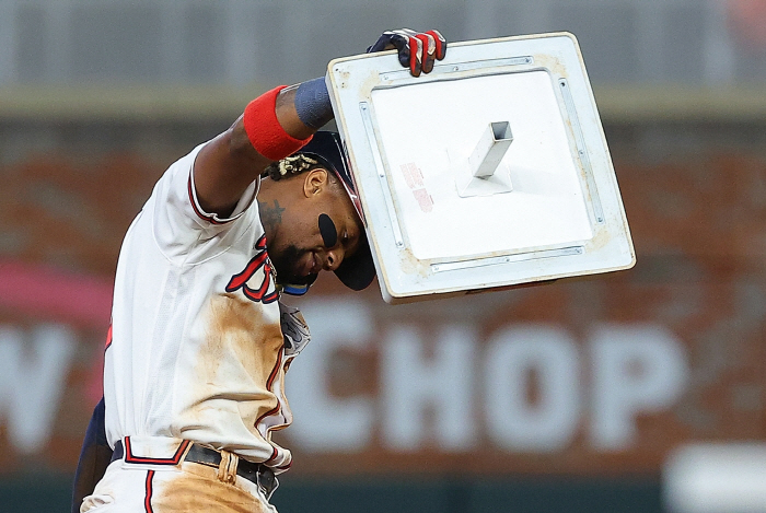 로날드 아쿠냐 주니어가 지난 9월 28일(한국시각) 시카고 컵스전에서 10회 2루 도루에 성공하며 40홈런-70도루 기록을 달성한 뒤 베이스를 뽑는 세리머니를 하고 있다. AFP연합뉴스