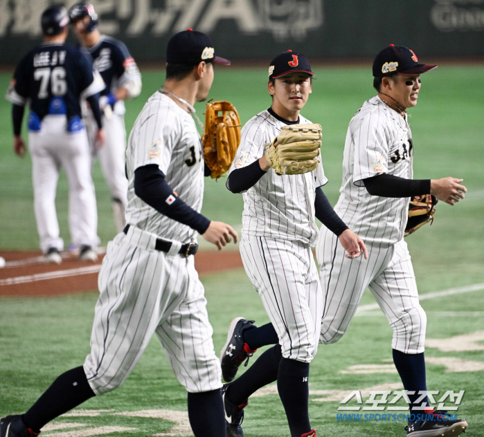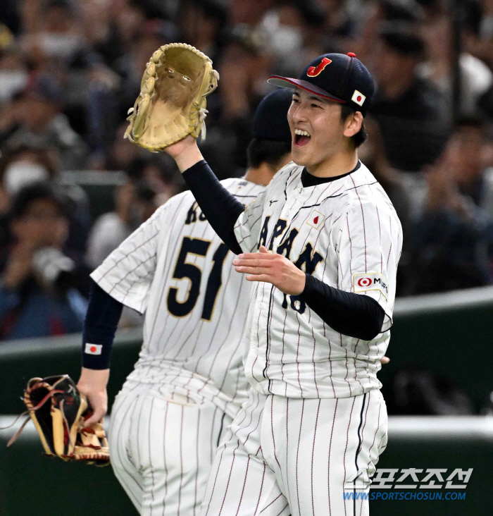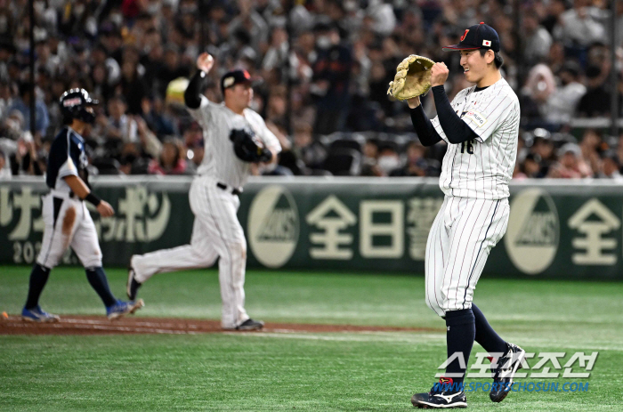 17일 일본 도쿄돔에서 열린 2023 아시아 프로야구 챔피언십(APBC) 한국과 일본의 경기. 7회초 1사 1루 김주원 안타성 타구를 일본 3루수 고조노가 잡아 이닝을 끝내자 선발 스미다 치히로가 기뻐하고 있다. 도쿄(일본)=박재만 기자pjm@sportschosun.com/2023.11.17/