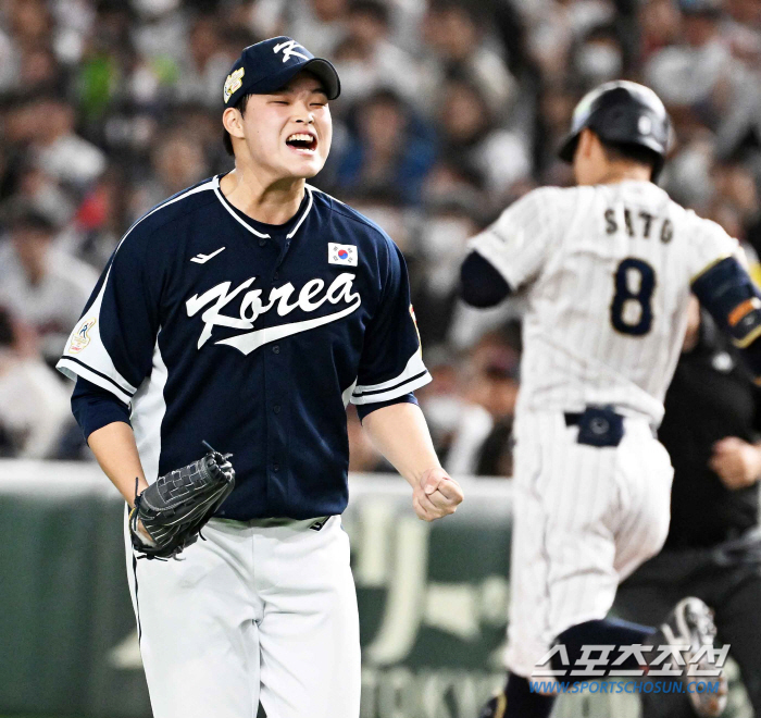 최지민은 가도와키와 8구까지 가는 승부를 펼쳤다. 가도와키는 최지민의 공을 4차례나 파울로 만드는 등 집중력을 보여줬다. 2B 2S 8구 째. 최지민-김형준 배터리는 하이패스트볼을 택했다. 147㎞의 빠른 공이 날아갔고, 가도와키의 방망이는 허공을 갈랐다. 한국이 한숨 덜어낼 수 있는 순간. 최지민은 침착하게 사토를 2루수 땅볼로 잡아내면서 이닝을 마쳤다.
