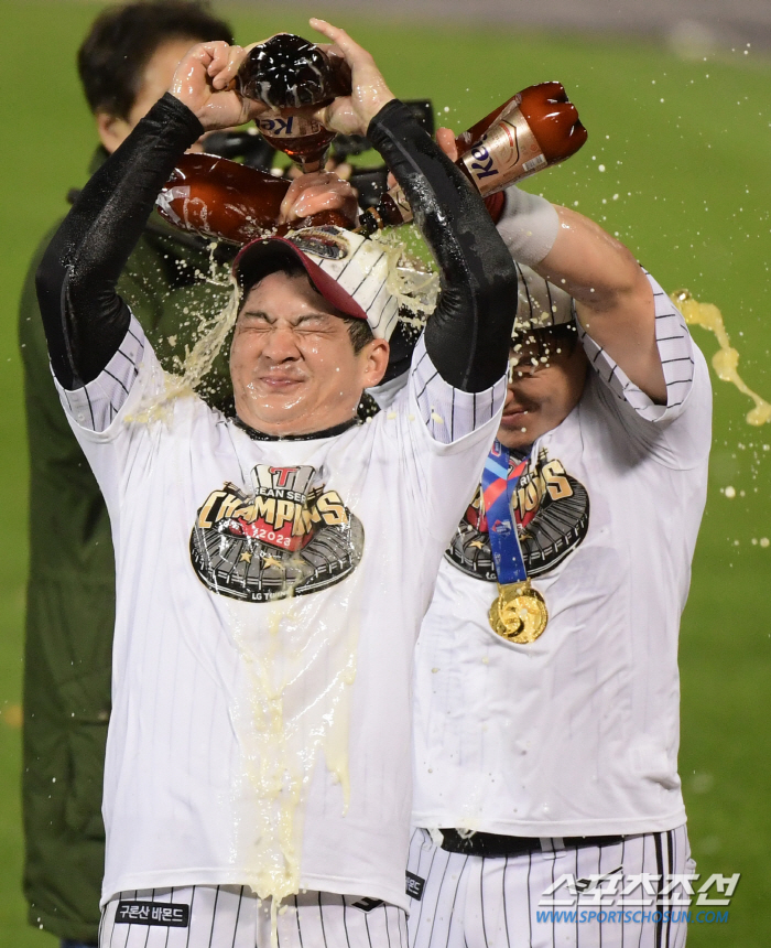 13일 서울 잠실구장에서 열린 KT와 LG의 한국시리즈 5차전. LG가 5차전을 승리하며 한국시리즈 우승을 차지했다. 오지환이 샴페인을 뿌리며 기쁨을 만끽하고 있다. 잠실=정재근 기자 cjg@sportschosun.com/2023.11.13/