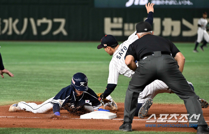 19일 일본 도쿄돔에서 열린 2023 아시아 프로야구 챔피언십(APBC) 한국과 일본의 결승전. 4회초 2사 1루 김혜성 안타 때 최지훈이 3루를 향해 몸을 날리고 있다. 도쿄(일본)=박재만 기자pjm@sportschosun.com/2023.11.19/