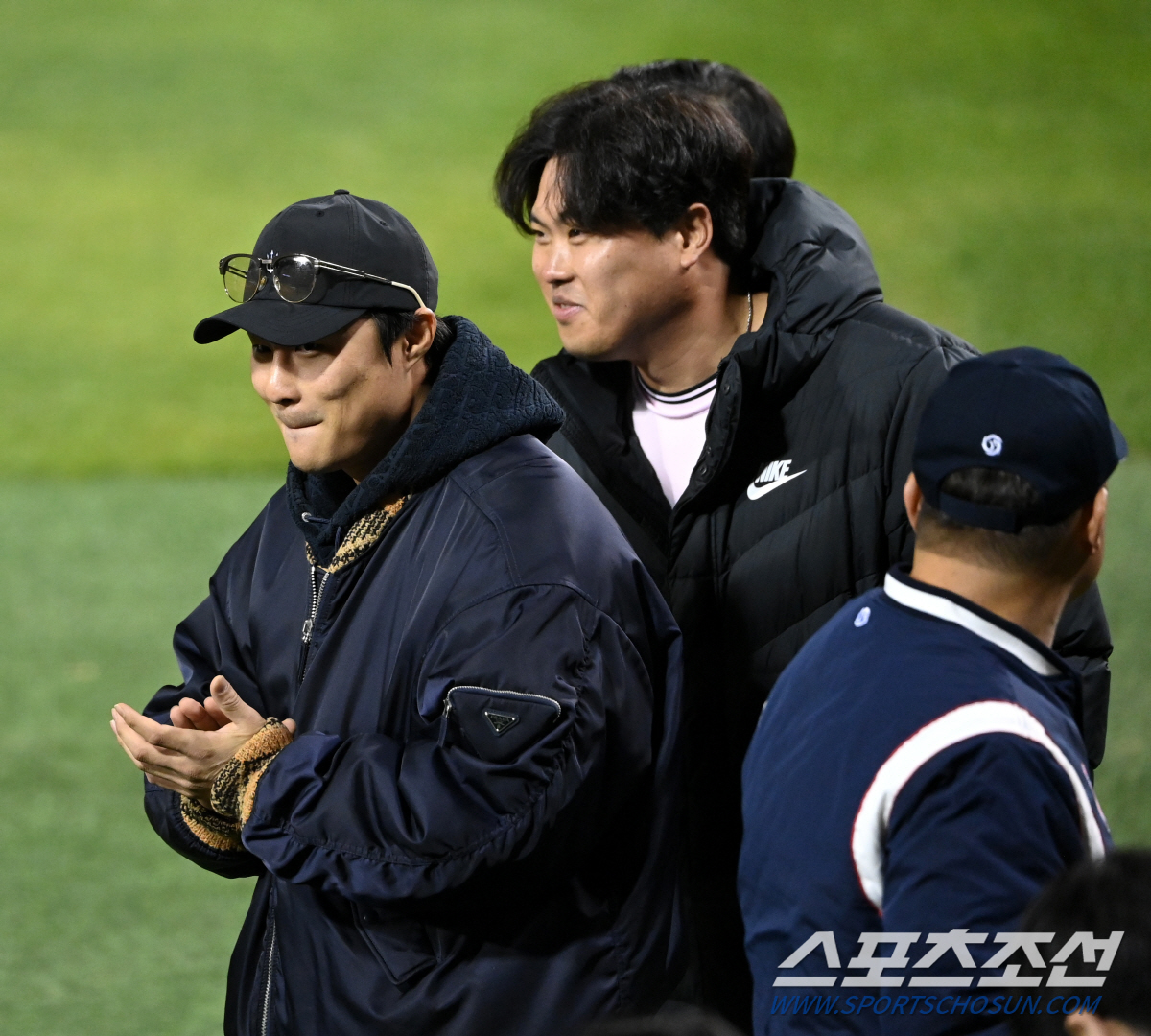 13일 잠실야구장에서 열린 KT와 LG의 한국시리즈 5차전 경기, 김성근, 김응용, 김인식 감독이 시구자로 박경완, 장채근, 홍성흔이 시포자로 나섰다. 시구행사에 함께한 김하성과 류현진이 레전드에게 박수를 보내고 있다. 잠실=허상욱 기자wook@sportschosun.com/2023.11.13/
