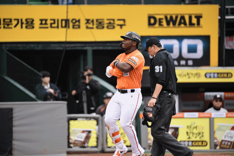 득점 순간 홈 베이스를 밟으며 겨드랑이에 양손을 넣는 세리머니까지 펼쳤다. 프랑스 축구국가대표 킬리안 음바페가 떠오르는 세리머니였다.