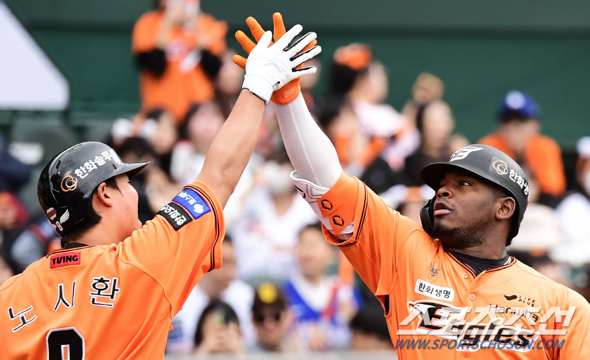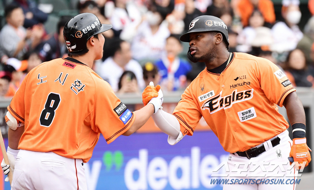 함께 득점한 노시환과 하이파이브를 나누며 손을 높이 드는 세리머니와 팬들에게 홈런 기념 인형을 던져주는 세리머니까지... 세리머니 종합선물세트를 선보였다.