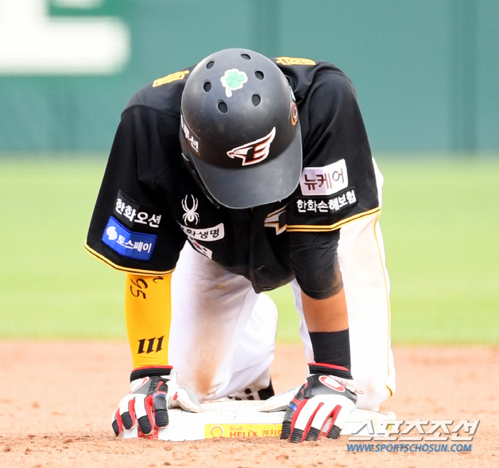 [대전=스포츠조선 박재만 기자] 첫 타석 볼넷 출루 이후 동점 득점까지 올리며 SSG 선발 김광현을 상대로 기죽지 않고 자신 있게 플레이 펼치던 한화 황영묵이 동점 찬스에서는 아쉬운 주루 플레이 이후 2루 베이스를 붙잡고 고개를 떨궜다.