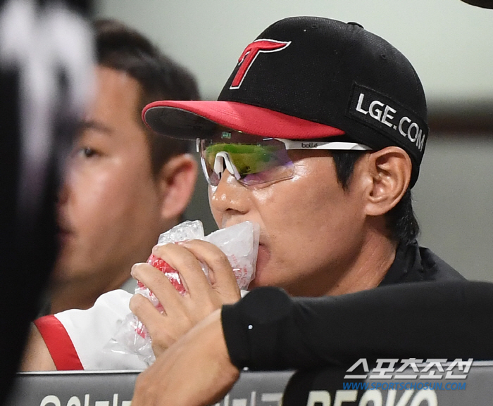 19일 광주 기아 챔피언스필드에서 열린 LG-KIA전. 염경엽 감독이 7회말 나성범의 파울타구에 얼굴을 맞았다. 염 감독이 얼음찜질을 하고 있다. 광주=정재근 기자 cjg@sportschosun.com/2024.6.19/