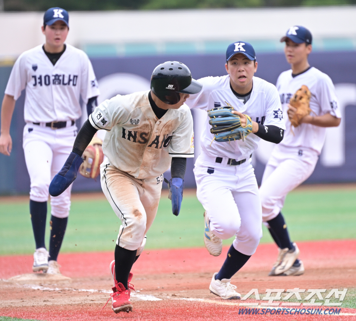 9일 서울 목동야구장에서 열린 제79회 청룡기 전국고교야구선수권대회 인상고와 경남고의 경기. 3회말 2사 2루 인상고 조승현의 안타 때 2루주자 양가온솔이 런다운에 걸려 아웃되고 있다. 목동=정재근 기자 cjg@sportschosun.com/2024.7.9/