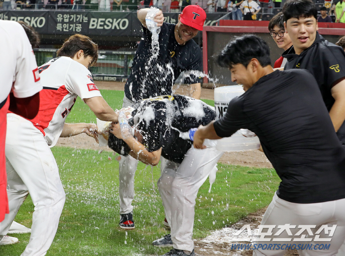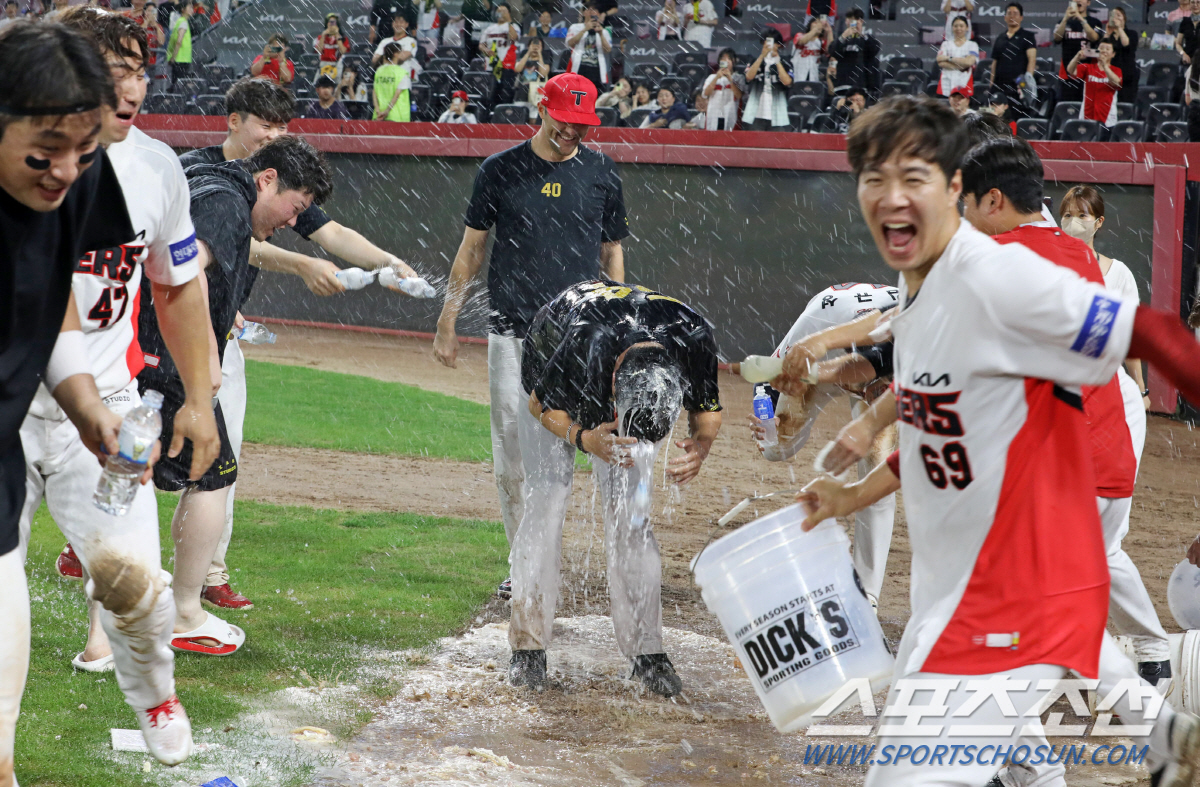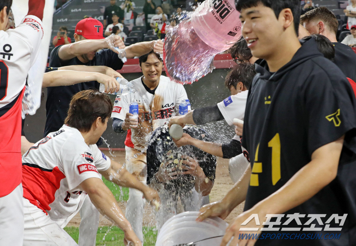 경기 종료 후 인터뷰를 마친 양현종은 동료들의 축하 물세례를 받았다. 평소 동료들의 기념이 있을 때마다 물세례의 주동자였던 양현종은 이번에는 물세례의 주인공이 됐다.