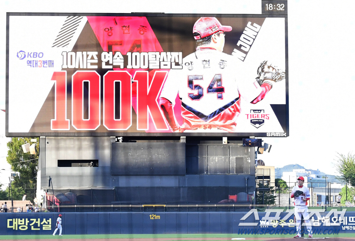 삼진 3개가 모두 의미가 있었다. 1회 황성빈 상대 삼진은 양현종이 10시즌 연속 100탈삼진을 달성한 순간이었다.