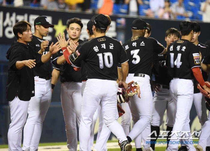 28일 서울 잠실구장에서 열린 KT-LG전. 10회 연장 승부에서 8대4로 승리한 KT 선수들이 승리를 자축하고 있다. 잠실=정재근 기자 cjg@sportschosun.com/2024.8.28/